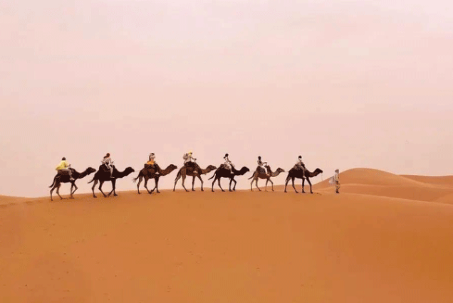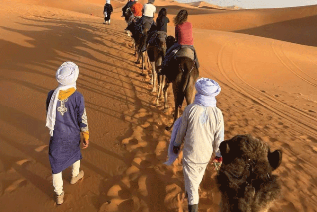 - Morning: The journey starts from M’Hamid after breakfast, where we meet Camels, and the camel drivers, will be ready, along with the cook. We will load our tents, food, and water supplies for the 8-day trip